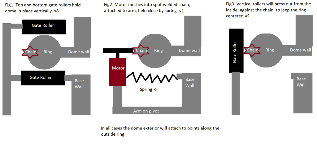 So, with the ring welded and, er, rounded, the next step was figuring out how to drive it, centre it, and secure it. For driving it the two options seemed to be using a motor connected to a rubber wheel that would push the ring along, or a gear pushing some teeth. Given the weight of the ring, and that more weight was yet to be added, using a gear and teeth seemed like it would provide the most consistent and reliable force to drive the ring around. Then the “easiest” way to add a gear and teeth to the setup would be to spot-weld some chain around the inside, and spring mount a motor with a gear. After that we just need some kind of rollers to hold the ring up, secure it, and keep it centred. Given that it’s best to keep all of the mechanisms inside the dome, to protect it from the weather, and that the motor would already be pushing the ring from the inside, I figured I could use rollers to keep the ring centred as it rotates. I drew up some nifty MS Paint diagrams, like all the pros do of course, to visualise my idea