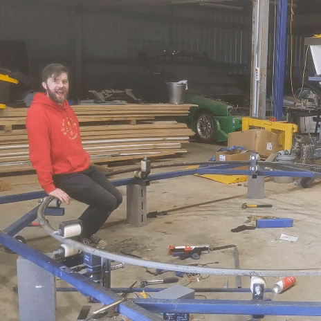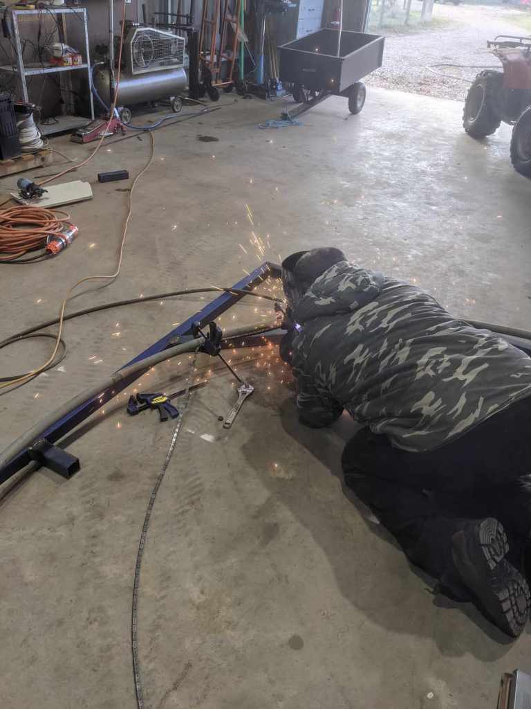 With the ring secured, it was time to weld the two pieces together. After getting my brother to weld the two pieces together we thought we could fix the shape a bit, as removing the fixings made it slightly oblong. How? Well…unfortunately I didn’t take video of this next part of the process, but imagine if you will a pine fence post, a ute with a bull bar, and this big metal ring getting squeezed between the two. It certainly wasn’t the most high tech solution, but here’s the result, alongside the start of the top of the frame