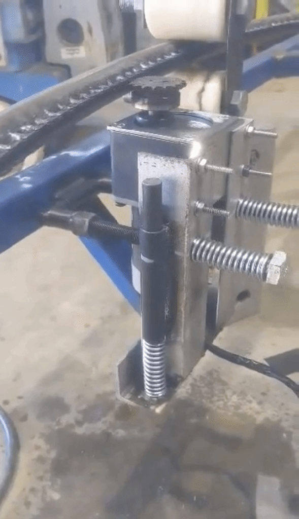 Success! Or at least, kind of. It turned out that despite our best efforts the ring was a little misshapen. Not just horizontally, but it also had some variance vertically as well (I guess 50 year old stock drips didn’t have such strict requirements). This meant that we couldn’t just use a spring on the horizontal axis to follow the chain, we needed to have a spring on the vertical axis as well. Luckily my brother came up with quite a genius approach: We could mount the motor on a sort of “floating cage”, where the motor could slide up and down, and back and fourth, on rails supported by springs, and a hinge supporting it from the bottom. These rails were also threaded, allowing the tension of the spring to be adjusted, and it certainly worked a treat!