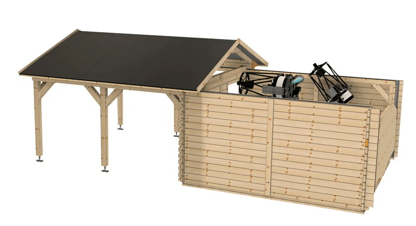 This here is a Roll-Off-Roof Observatory from Greenline (credit to Testar, where you can view the product here). Roll off roof observatories are a straight forward design, generally cheaper to buy or make, with less moving parts and more space to work on your telescope. When you’re ready to start your session you can roll the roof off, either manually or automatically depending on your setup, and roll it back when you’re done. Simple right? They are a very popular design, given their ease of use, and they are especially handy if you want to house more than one telescope. Their main drawback is the view you get, as typically you wont get sightlines down to the horizon, restricting you to targets higher in the sky. This might not be a problem for you as either you’re happy with the trade off, or perhaps the location you want your observatory has a lot of trees or houses that already restrict your views. Some of these shortcomings can be overcome with other mechanisms, but we won’t cover that here. Their second drawback is the space they take up, as you effectively need twice the size of the observatory footprint to have room for the roof mechanism.