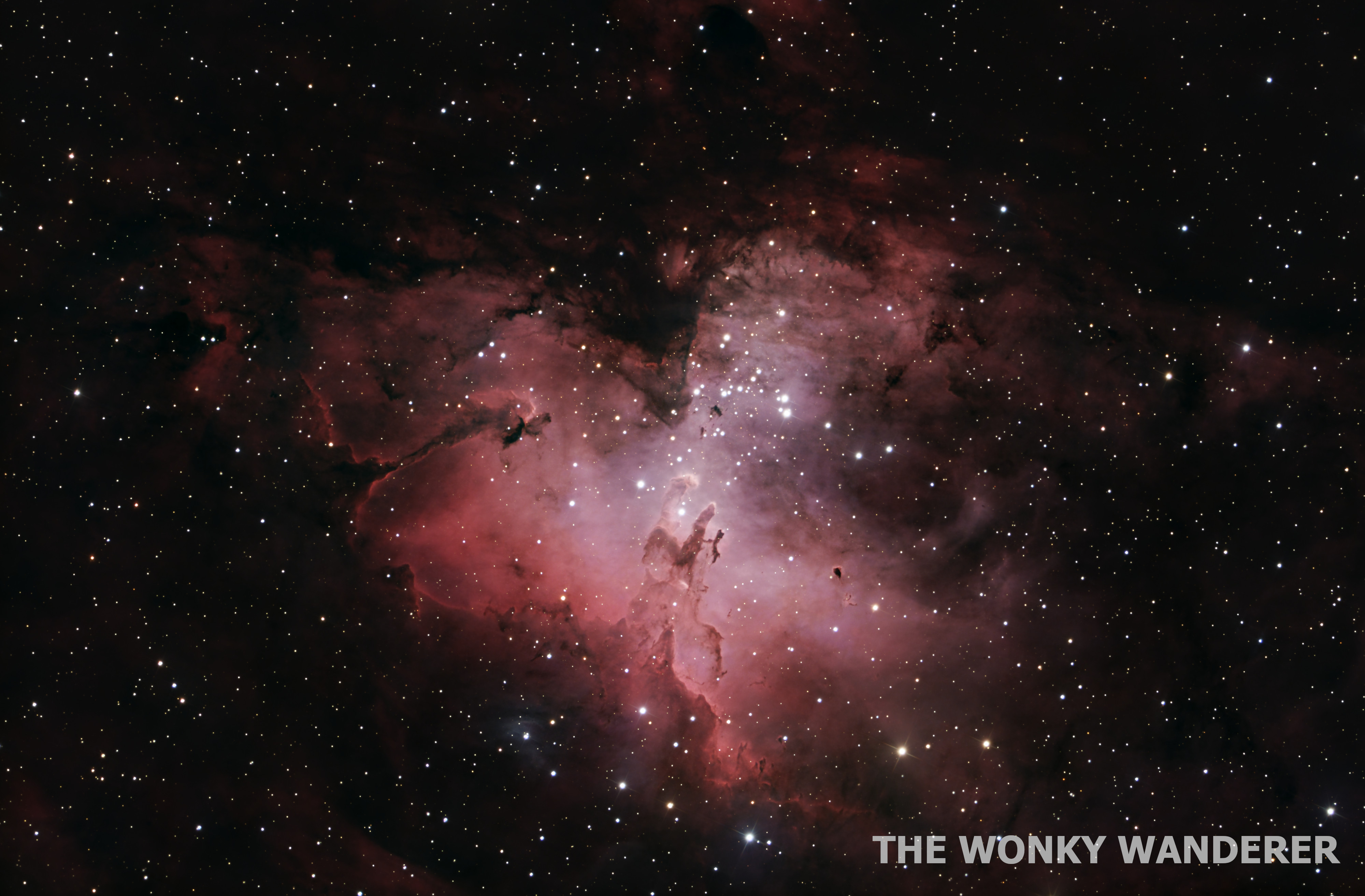 The Eagle Nebula, also known as M16 or by its much cooler title: “The Star Queen Nebula”, is an emission nebula located in the Sagittarius Arm of our Milky Way. It was made famous when the central structure, dubbed “The Pillars of Creation”, was imaged in amazing detail by the Hubble Space Telescope (and by JWST many years later). The nebula contains several active star-forming gas and dust regions, and is rich in ionized hydrogen leading to it’ reddish appearance.