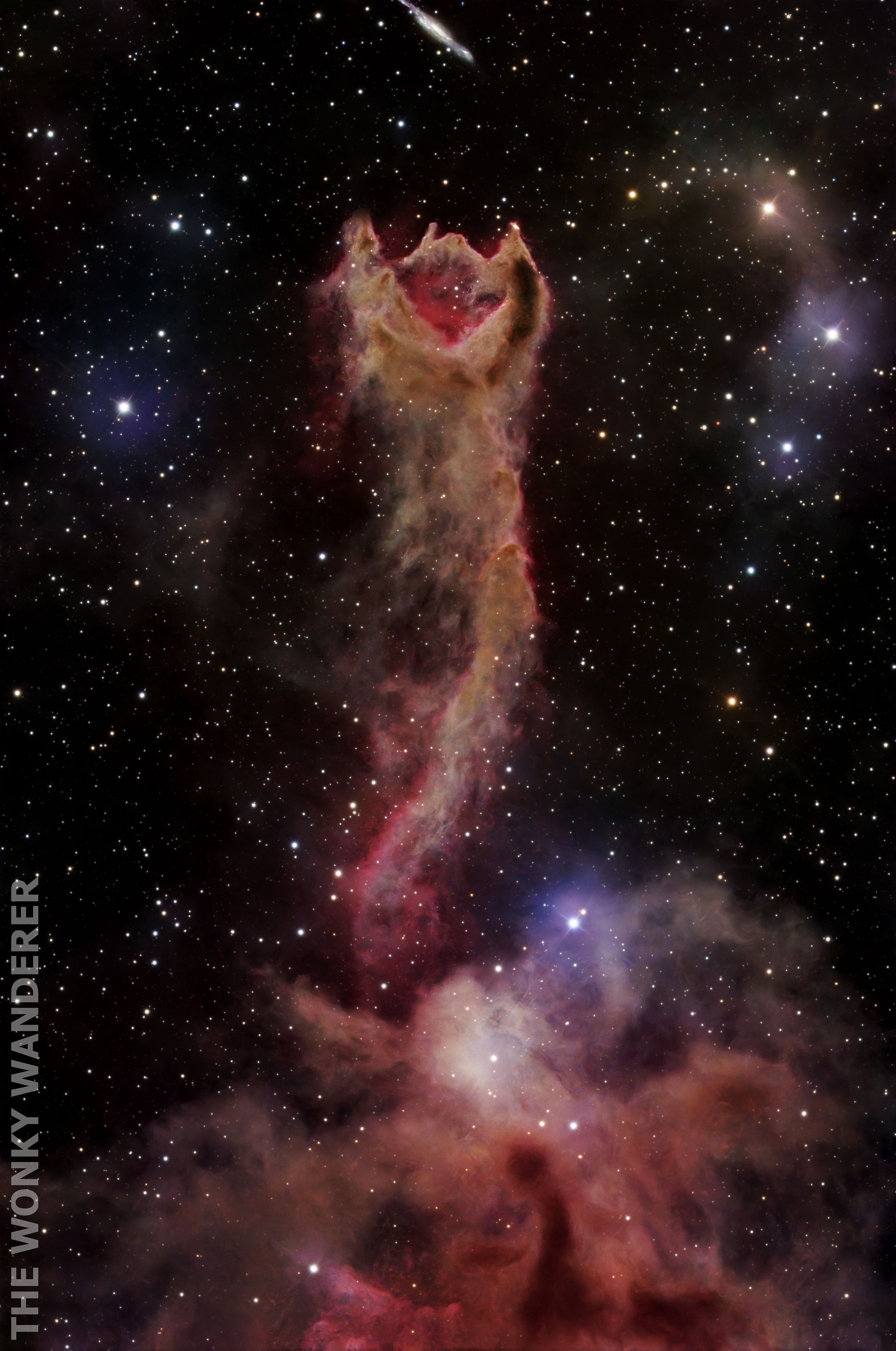 God’s Hand, CG4, or “Shai Hulud” if you’re a Dune fan, is what’s known as a “cometary globule”, due to its resemblance to a comet. The head, or “mouth”, of the nebula is composed of dense matter that is iilluminated by ionized hydrogen. Adding to it’s unique features, the mouth of the nebula appears ready to consume the galaxy ESO 257-19.
