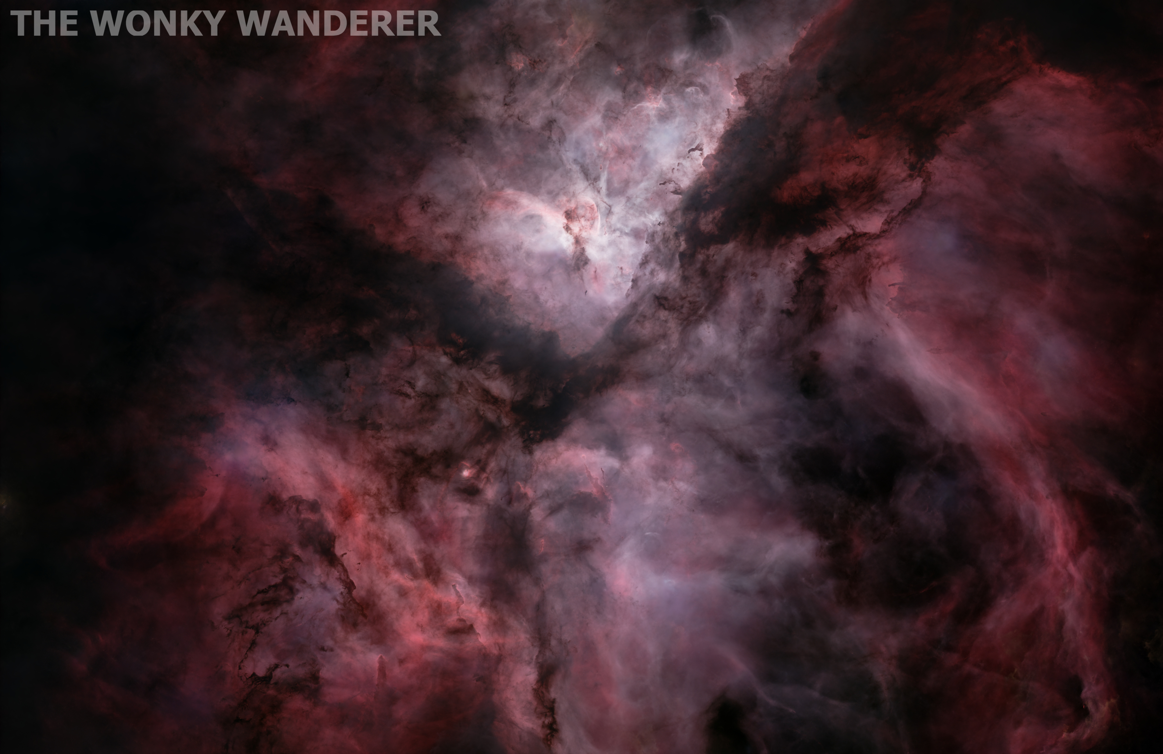 The Great Carina Nebula, The Carina Nebula, or just NGC 3372, is a massive area of nebulosity in the constellation of Carina. Spanning a whopping 230 light years it’s a complex structure containing multiple nebulae and star clusters. It’s the brightest nebula in the southern skies, and four times the size of the Orion Nebula. In the centre you can see the Keyhole nebula, and next to it the bright star is a dual star system called Eta Carinae, which is also obscured by yet another tiny nebula known as the Homunculus Nebula.