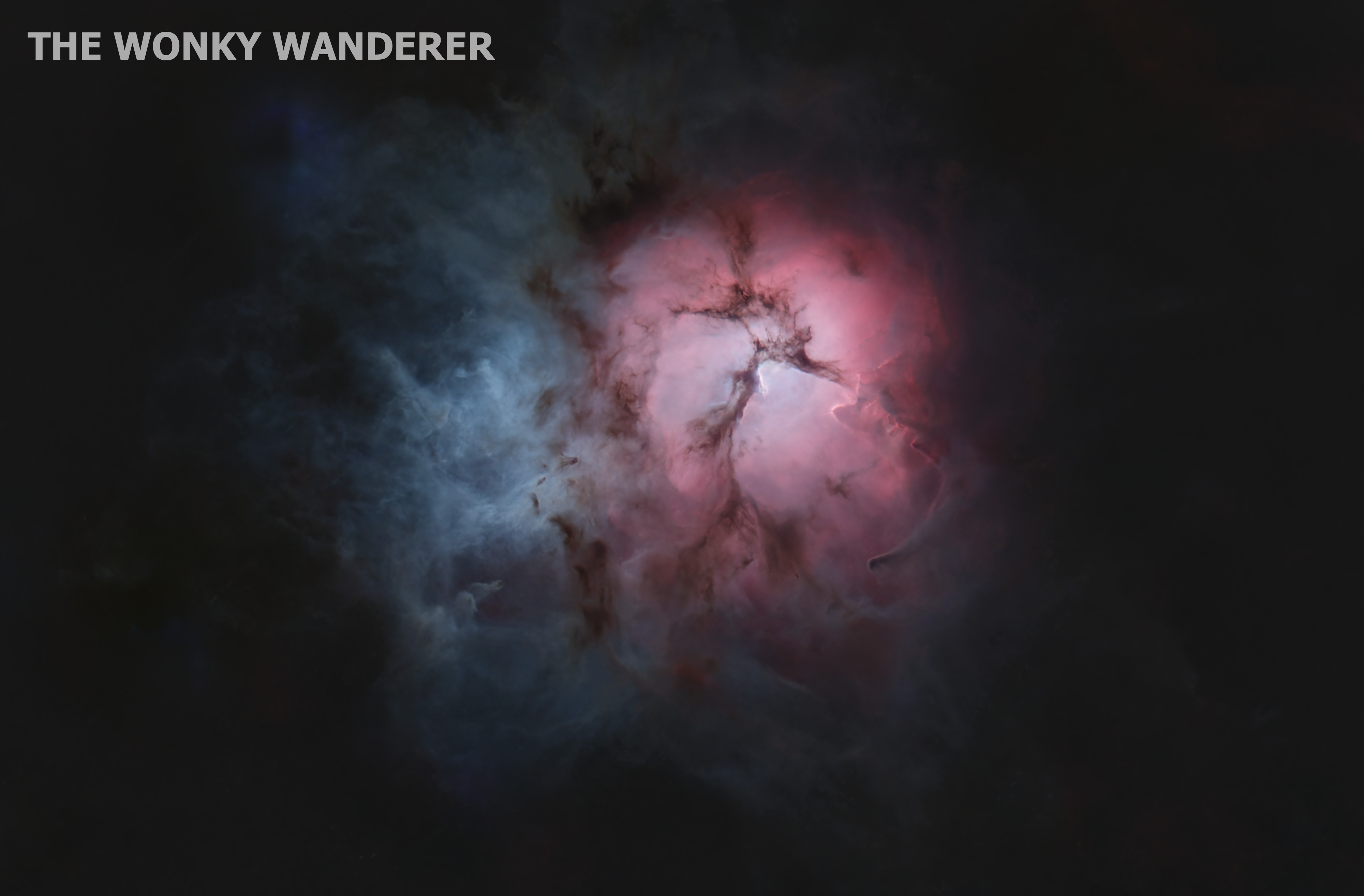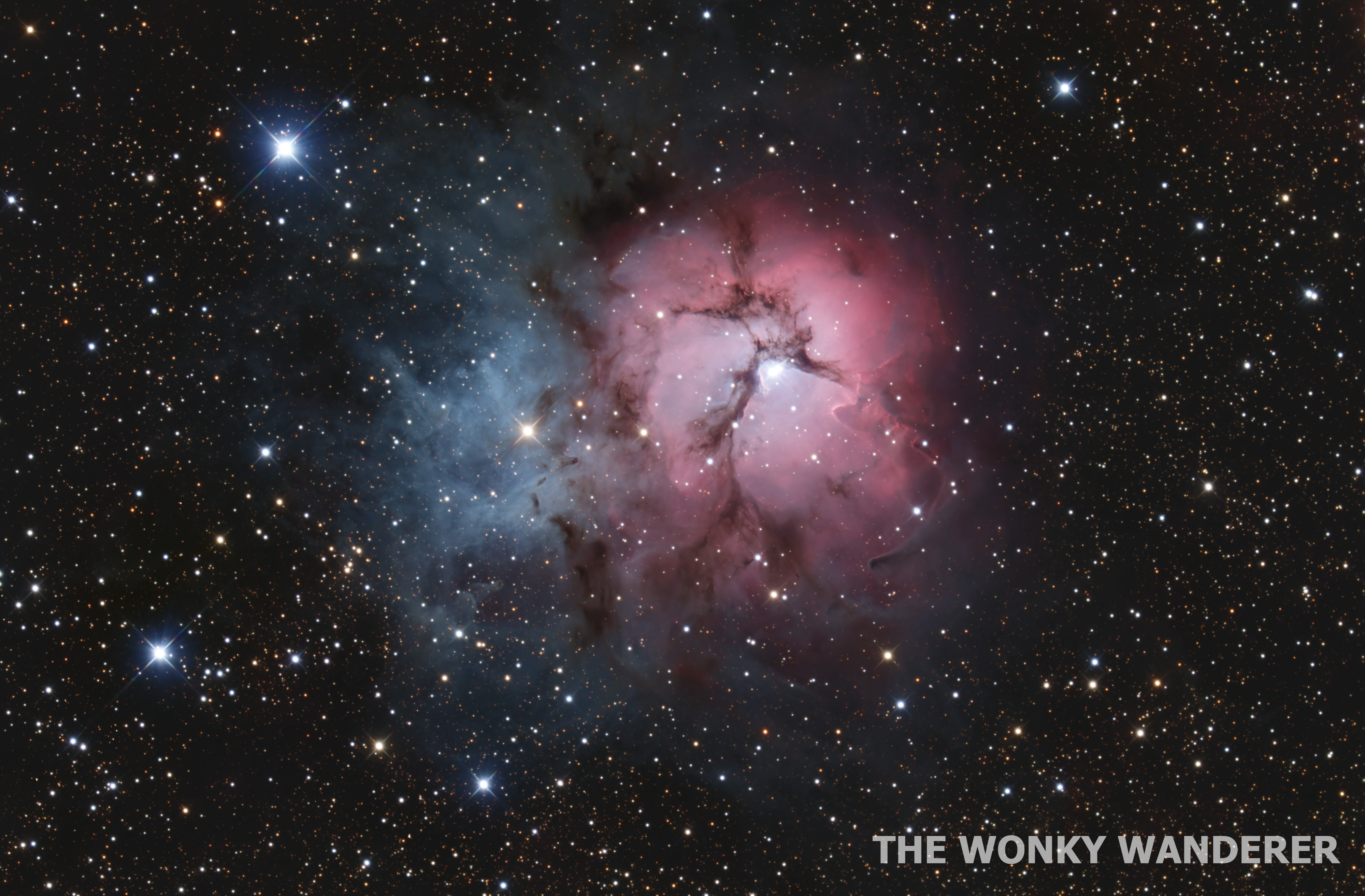 M20, or the Trifid Nebula, is an unusual combination of an emission nebula (pink), reflection nebula (blue), a dark nebula, and an open cluster of stars. It’s located north-west of Sagittarius and is approximately 4100 light years away